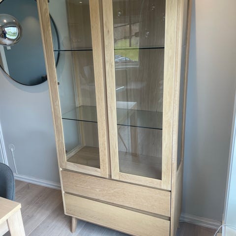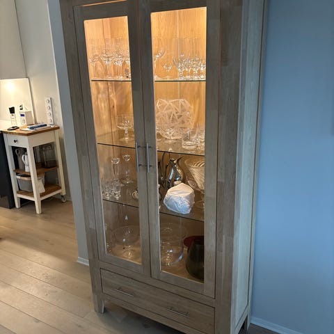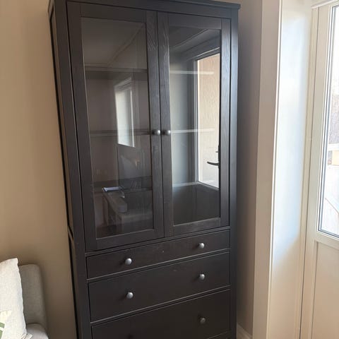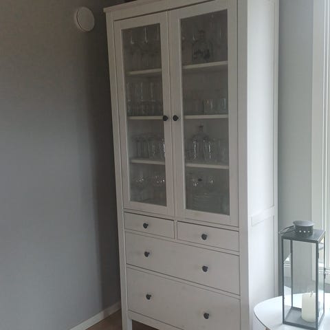 Hei! Jeg selger mitt helt nye HEMNES vitrineskap fra IKEA. Det må hentes, men jeg kan hjelpe med å demontere det og evt bistå deg med å bære ned til bilen. Jeg har byttet håndtak på skapet, men de originale følger også med, dersom dere heller ønsker å bruke disse.