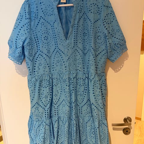 Kjolen er i blå bomull med broderie anglaise-liknende hullmønster. Den har V-utringning, korte ermer og volangskjørt med flere rynkede partier som gir en løs og komfortabel passform. Materialet er lett og egner seg til bruk i varme perioder.