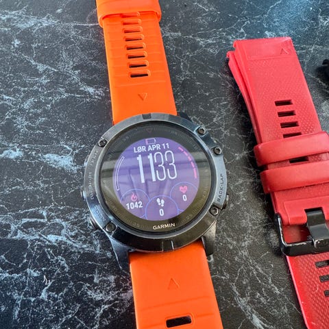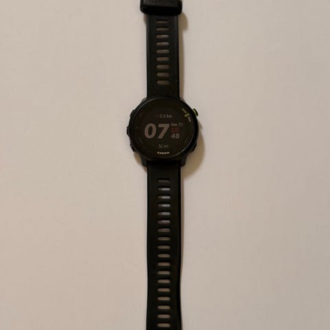 Garmin Forerunner 945 pulsklokke med GPS i svart urkasse. Klokken leveres med flere utskiftbare silikonreimer i ulike farger, blant annet gul, rød og grå. Modellen har innebygd GPS, pulsmåling på håndleddet, aktivitets- og treningsregistrering, samt støtte for funksjoner som Garmin Pay, musikk og kart ifølge esken. Egner seg til løping, sykling, svømming og annen utholdenhetstrening, samt daglig aktivitetsmåling og klokkevisning.