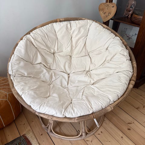 Eldre Papasan-stol med noen feil og mangler, men den er fremdeles i grei stand og har vært i daglig bruk frem til nå.