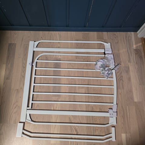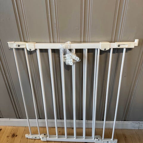 Hvit sikkerhetsgrind til trapp. Grind i metall med vertikale spiler og åpning i midten. Monteres i døråpning eller øverst/nederst i trapp for å hindre at små barn eller kjæledyr går i trappen. Passer for innendørs bruk. Justerbar bredde avhengig av monteringsløsning og veggfester.