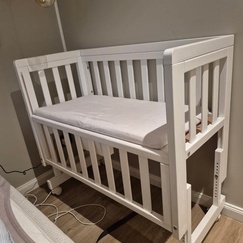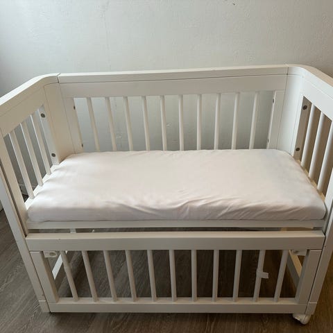 Bedside crib fra Troll. Fint brukt, ikke feil som vi har merket. Bremser på beina og kan justere høyden. Tar lite plass!
