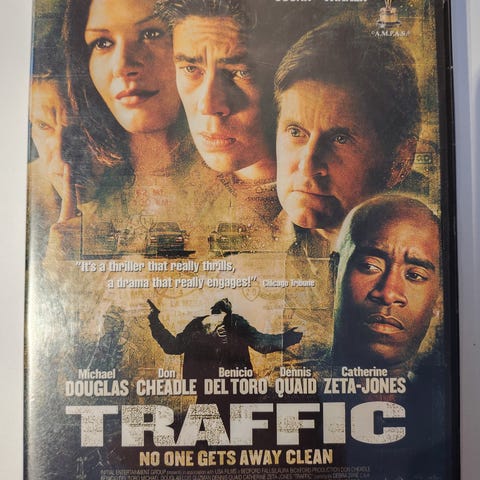 Traffic DVD film. Spillefilm utgitt på DVD i standard plastetui. Omslag og plate viser tittel og rollebesetning. Tekst og lydspor følger vanlig DVD-standard for region 2 (Europa). Egnet for avspilling på kompatible DVD-spillere.