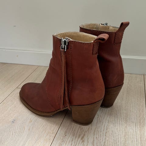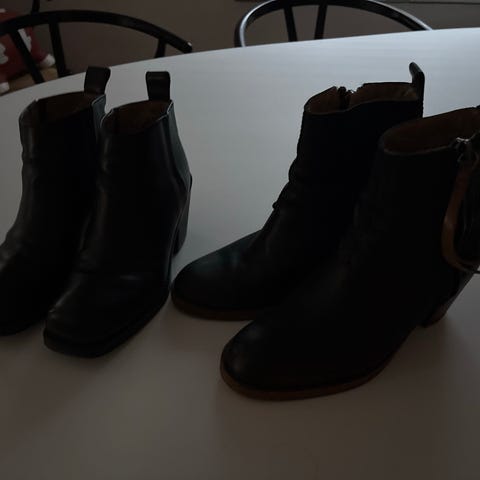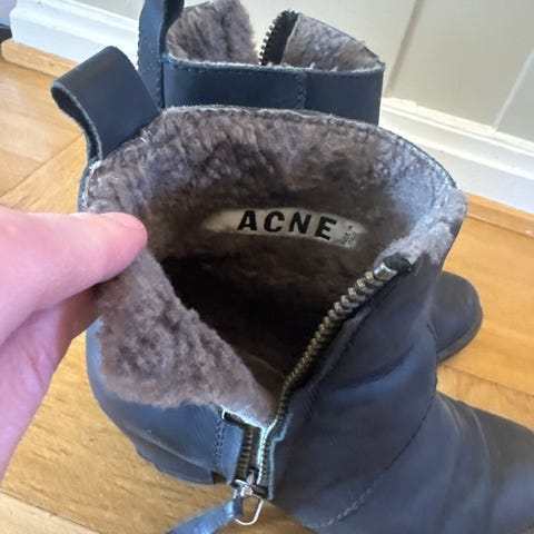 Acne Studios støvler i størrelse 38. Ankelhøye støvler i svart skinn med lav hæl og lys sålekant. Modellen har rem og spenne rundt ankelen og glidelås på innsiden for enkel av- og påkledning. Passer til hverdagsbruk og kan kombineres med både bukser og skjørt/kjole.