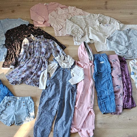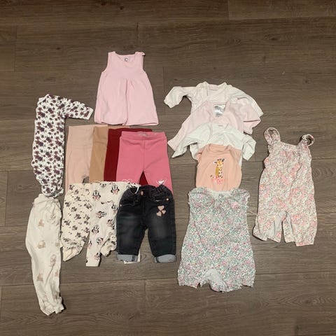 Stor klespakke til jente i str. 92. Klær fra H&M, Name it, Lindex og Newbie. Meget pent brukte klær, ingen hull eller andre anmerkninger bortsett fra noe få flekker på pysjen og den ene genseren (hvit/rosa).