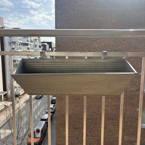 Praktisk og moderne balkongkasse i sort metall med bøyler for festing på rekkverk