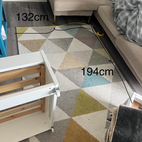 Teppe er i god stand, men har fått noe ujevn farge/lett misfarging etter vask (se bilder). Dette er mest synlig i enkelte områder, men påvirker ikke bruken.