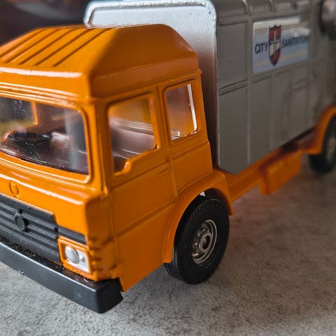 Scania 141 lekebil lastebil i rød farge. Modellen viser en lastebil med tilhenger, med detaljer som frontgrill med Scania-logo og 141-merke. Egnet som samlerobjekt eller lekebil for barn som liker lastebiler og kjøretøy i miniatyr.