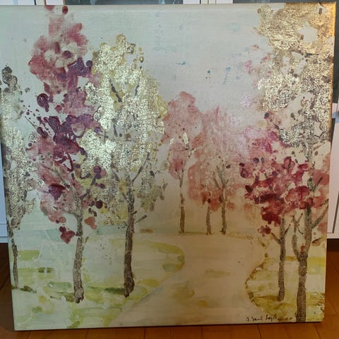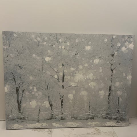 Maleri på lerret med motiv av flere trær. Fargene går hovedsakelig i blå, hvite og grå toner. Bildet har kvadratisk format og passer for eksempel på stuevegg, soverom eller gang. Kan henges alene eller sammen med andre bilder som en del av en bildevegg.