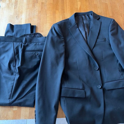 Bukse i str.34/34 og lang jakke i str.50.