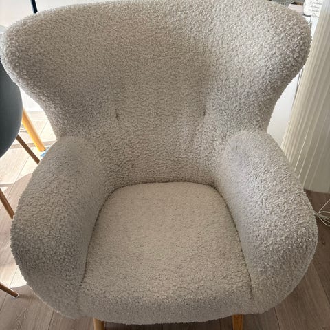Veldig god å sitte i, deilig «teddystoff», og god nakkestøtte.