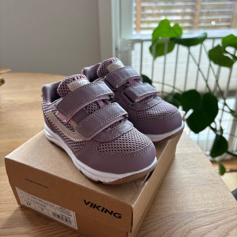 Ponny barnesko i størrelse 24. Skoene er i lilla med oransje detaljer og har to borrelåser for enkel justering og av- og påkledning. Overdelen er i tekstil og syntetisk materiale med pustende meshpartier. Skoene har Sympatex-membran som gjør dem vanntette. Yttersålen er mønstret for godt grep. Egnet som hverdagssko og til utelek for barn.