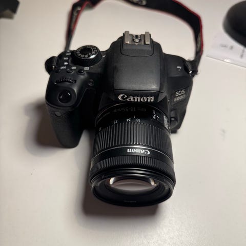 Canon speilreflekskamera i svart med utskiftbart objektiv. Kameraet leveres med et zoomobjektiv (som vist på bildene), skulderreim, batterilader med strømkabel og en polstret kamerabag med inndelinger til kamerahus, objektiv og tilbehør. Egnet til generell fotografering, reiser og hobbybruk.