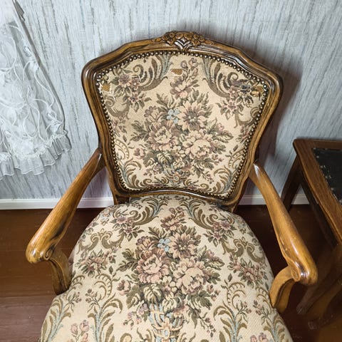 Lenestol i tre med rotting i sider og rygg. Stolen har løse sitte- og ryggputer i grått tekstil. Klassisk utforming med dreide stolben og armlener i tre. Egnet som ekstra sitteplass i stue, lesehjørne eller andre oppholdsrom.