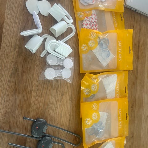 Jeg selger to uåpnede pakker og en åpnet, totalt er det sikring til 23 skuffer eller skapdører, samt en vinduslås fra babydan. Vi var veldig fornøyd med disse låsene til skuffene på kjøkkenet, men kjøpte altfor mange.