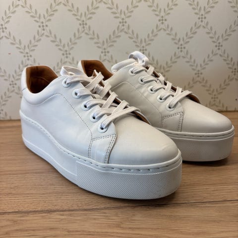 Stockholm Design Group sneakers i størrelse 40. Modellen er lave joggesko i hvit farge med snøring foran og platåsåle. Overdelen er i glatt materiale med runde lisser og metallmaljer. Skoene har polstret hælkappe og flat yttersåle som gir stabilitet ved hverdagsbruk. Passer som fritidssko og til daglig bruk.