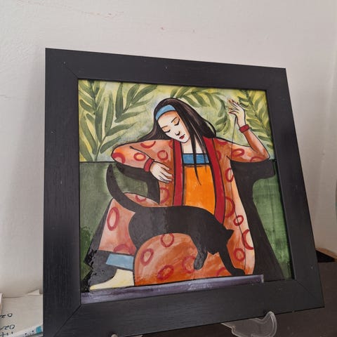 Aldeles nydelig bilde i keramikk lignende materiale med uthevet dekor som nytt.