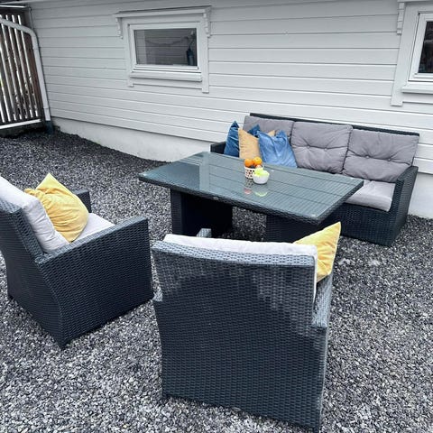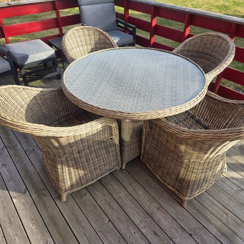 Ubrukt spisegruppe i rotting til salgs da den ikke har vært i bruk. Stått tildekket og fremstår som ny inkludert puter og beskyttelsestrekk.