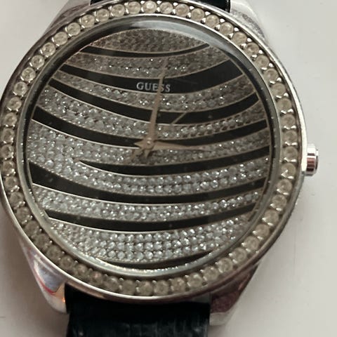 Guess dameklokke i sølvfarge med tydelig Guess-logo på urskiven. Klokken har rund urkasse med dekor langs kanten og analog visning. Remmen er i sølvfarget skinn med spenne. Passer som hverdagsklokke eller til penere antrekk for dame.