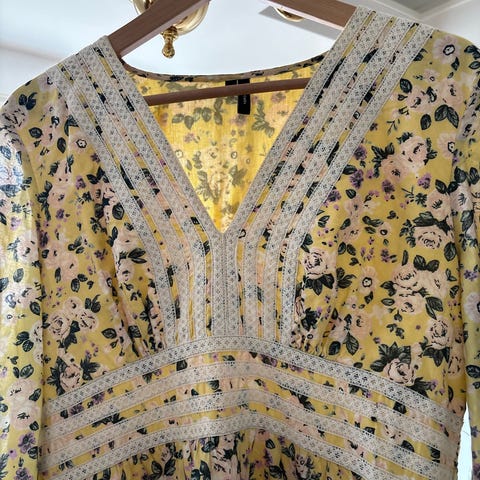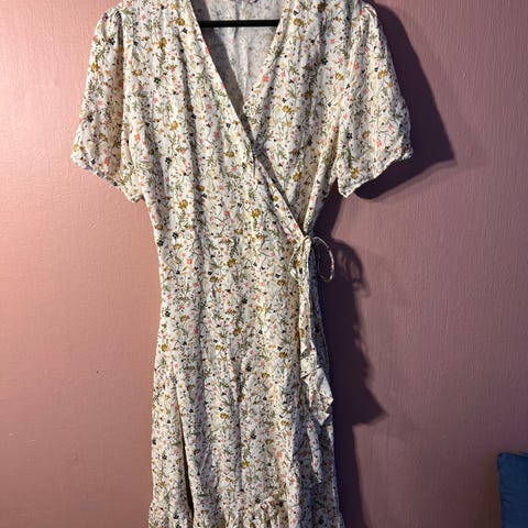 Vero Moda sommerkjole for dame i størrelse XL. Kjolen er gul med blomstrete mønster og laget i polyester. Modellen har kort lengde, korte ermer med lett volangkant og knytebelte i livet. Stoffet er lett og egner seg til bruk i varme årstider. Passer som hverdags- eller fritidskjole.