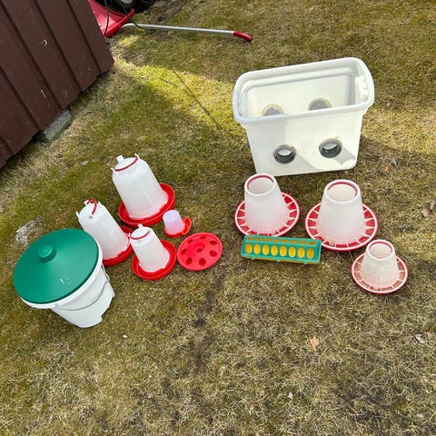 Kyllinger utstyr 1,5L drikkekar + fôringsautomat 1,5kg startfôr til kyllinger