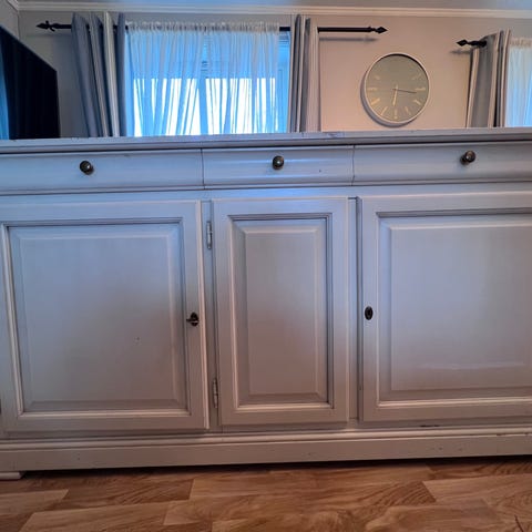 Selger en eldre solid sjenk. Den rommer mye og er av heltre furu. Malt hvit utenfor, ikke inni.