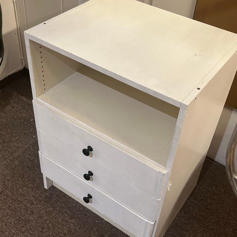 En brukt kommode/nattbord i god kvalitet. Synlig brukt men i god stand. Høyde: 71,5cm, Bredde: 42cm, Dybde: 32cm. En litt løs skrue på hengslen, men kan enkelt fikses/byttes. Vare må hentes!