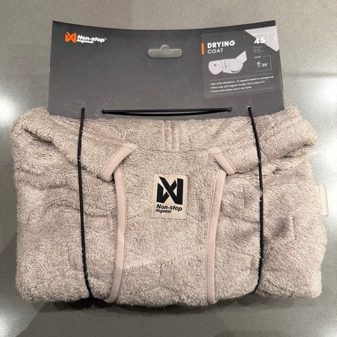 Non-stop Dogwear Drying Coat hundedekken i grå farge. Dekkenet er laget i et mykt og absorberende materiale med komfortabelt innerlag som hjelper til med å tørke hundens pels. Ytterstoffet har frottélignende struktur, og dekkenet har justerbare benstropper for bedre passform. Egner seg etter tur, bading eller trening for å holde hunden varm og tørr. Selges da den ble for stor for min hund kun prøvd på