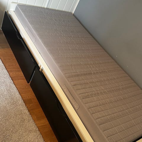 IKEA seng med madrass. En enkeltseng med rektangulær ramme og madrass, egnet for ett sovested. Passer til soverom, gjesterom eller hybel. Fargen på sengetøyet på bildet er mørk, men dette følger ikke nødvendigvis med. Sengen står på ben som gir plass under til oppbevaring etter behov. 2 ikea senger billigere om du kjøper begge