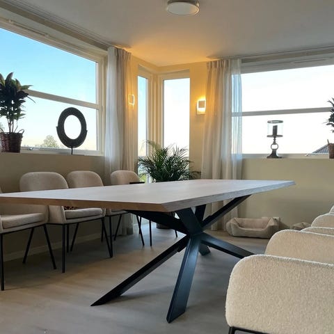 Oppdatering: Det har dessverre oppstått et lite hakk i kanten etter at en tung gjenstand ble mistet på bordet (se bilde). Dette er kun en kosmetisk skade og påvirker ikke funksjon eller stabilitet. Skaden kan enkelt utbedres: bruk en hvit møbelpenn eller reparasjonsvoks (fås hos f.eks. Jula, Clas Ohlson eller Biltema), fyll inn merket forsiktig, jevn ut overflaten og la det tørke. Resultatet blir svært pent og nesten usynlig i vanlig bruk – bordet fremstår da igjen som helhetlig og stilrent.