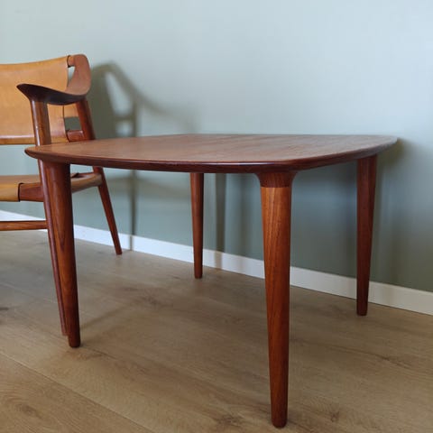 Selger dette nydelige teakbordet. Veldig pent brukt. Beina er i bøk. Følger med to ileggsplater, så bordet blir ca 190cm, de er i annet materiale. Beina kan lett skrus av og på.