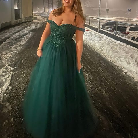 Denne eksklusive ballkjolen kombinerer tidløs eleganse med luksuriøse detaljer. Kjolen har en feminin off-shoulder utringning som fremhever skuldrene og gir et sofistikert uttrykk. Overdelen er rikt dekorert med delikat broderi, perler og glitrende applikasjoner som gir et eksklusivt og festklart preg.