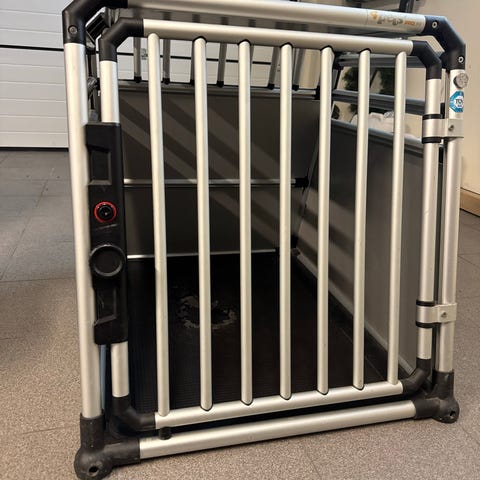 Hundebur i aluminium med svarte sideplater. Skrå bakvegg.