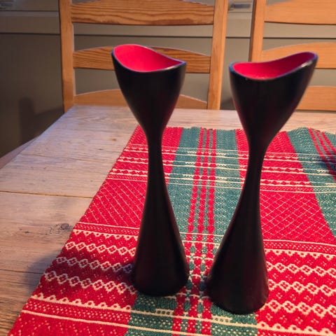 Settet består av én rød og én sjelden gul variant. De er i veldig fin stand med klare, sterke farger og står stødig på sine dreide tre-bein.