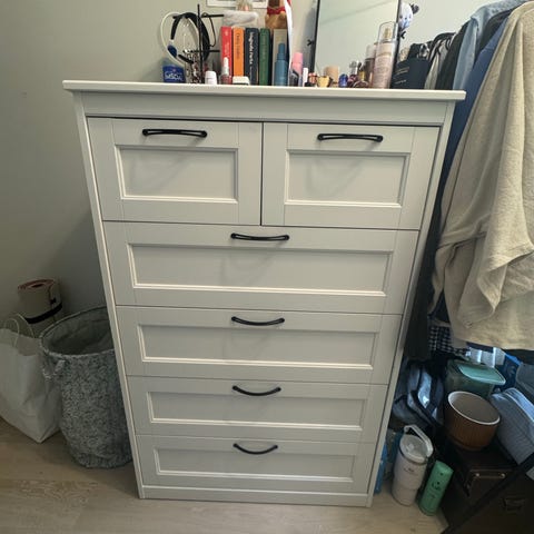 Kommode med med 6 skuffer. Riper/merker på topp . Bunnplatene i skuffene er i god stand.