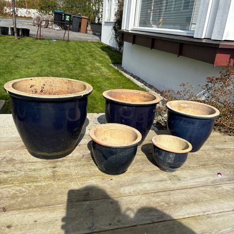 Store utendørs blomsterpotter i keramikk. Pottene er blå på utsiden med dekorativt motiv og har naturfarget kant øverst. Innsiden er lys og har dreneringshull i bunnen som slipper ut overflødig vann. Egnet til planting av busker, små trær eller større planter på terrasse, i hage eller ved inngangsparti.