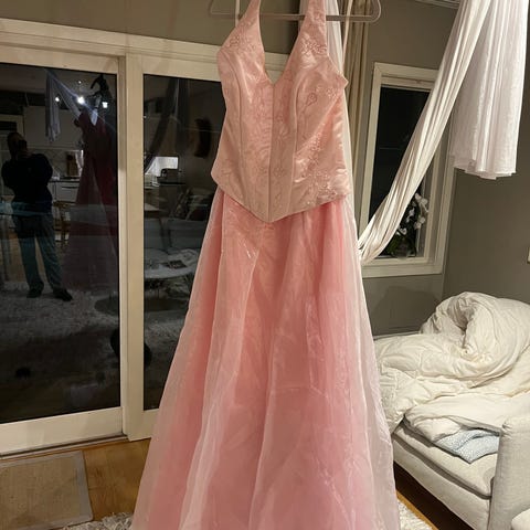 Kjole til spesiell anledning for dame i størrelse M/L .Lang kjole i rosa polyester med voluminøst skjørt i flere lag. Overdelen har brede stropper i transparent stoff og V-utringning med dekorative detaljer. Ryggen har snøring som kan justeres for bedre passform. Stoffet er lett og lagdelt, egnet til bruk ved formelle anledninger som selskaper og andre spesielle begivenheter.