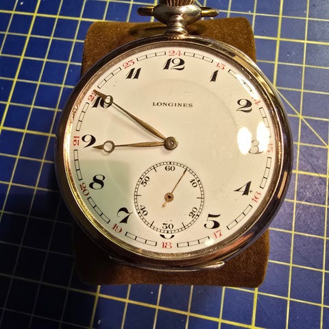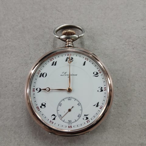Selger et flott og klassisk Longines lommeur i sølv (0.800), med en spennende historisk detalj.