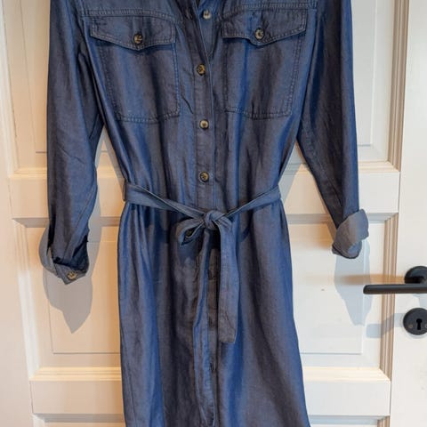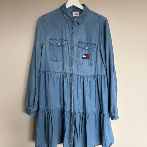 Tommy Hilfiger hverdagskjole i denim for dame i størrelse M. Kjolen er blå og laget i mykt denimstoff. Den har lange ermer, krage og knappelukking hele veien ned i front. Det følger med knytebelte i samme stoff for justering i livet. Klassisk skjortekjolefasong som passer til hverdagsbruk.