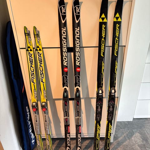 2 par godt brukte smørefri langrennski. Det eine paret har lengde 140 cm og det andre paret er 150 cm lange.