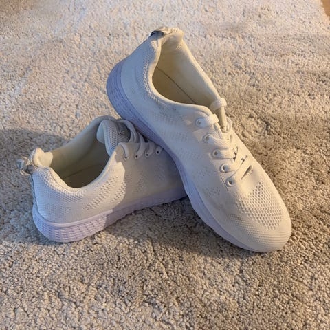 Selger et par lette sneakers/joggesko i merke ukjent.hvite sko gått en liten tur i tørt vær med disse bare så er ubetydelig brukt.flotte som f.eks; joggesko/fritidssko til bryllup,eller bare som fritidssko.str 39. Kan sendes mot porto i tillegg.betaling via Vipps .sko fremstår som helt nye.gode i passform.send pm da vel😊
