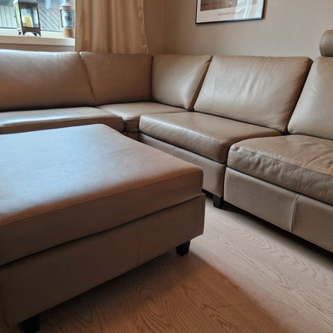 Modulsofa / Hjørnesofa med puff i lyst skinn