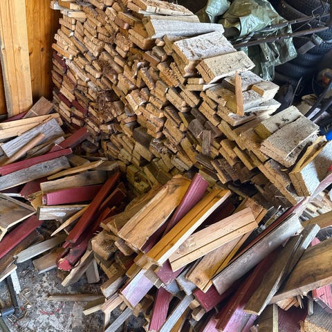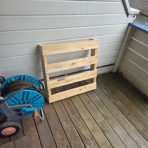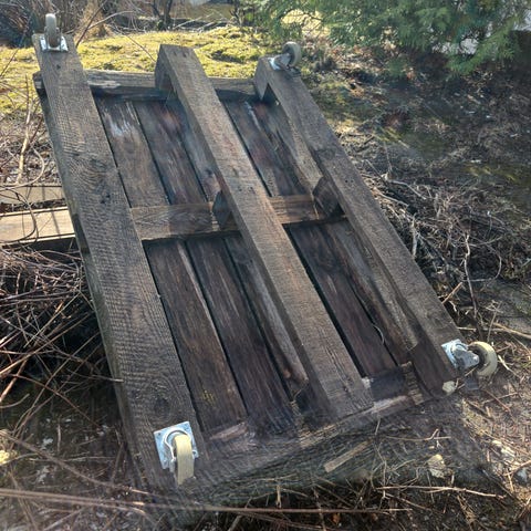 Tre paller gis bort. To av dem har stått inne i en garasje i halvannet år. Den tredje pallen har stått utendørs.