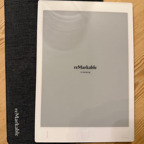 Særdeles lite og pent brukt Remarkable 1. generasjon med mappe i ull til å ha den i. Ekstradeler og ladekabel medfølger som vist på bildene. Selges fordi den aldri har blitt tatt ordentlig i bruk. Mappen ser litt brukt ut, men i veldig god stand.