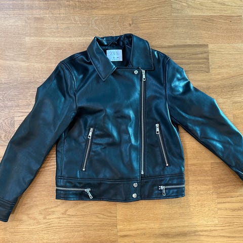 Tøff Svart "Skinnjakke" Imitert Skinn Til Barn str 140 / 10 år - Pent Brukt