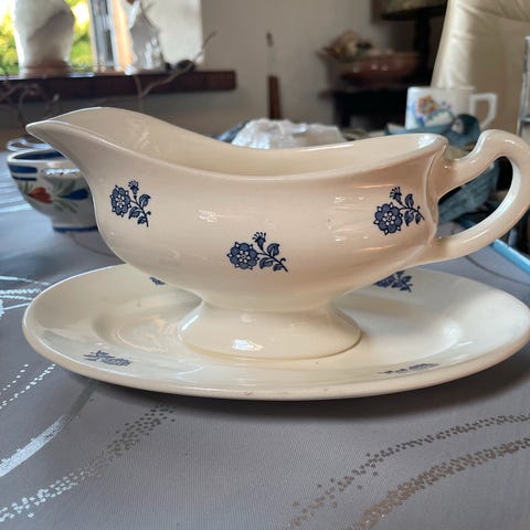 Rørstrand Gurli sausnebb i glasert keramikk. Modellen er merket «Gurli» under, sammen med Rørstrand- stempel. Sausnebbet er hvitt med blå og brune dekorlinjer langs kant og fot. Det har helletut i den ene enden og hank i den andre. Størrelsen fremgår av bildene med målebånd og viser et middels stort sausnebb egnet til servering av saus eller andre flytende tilbehør ved borddekking.