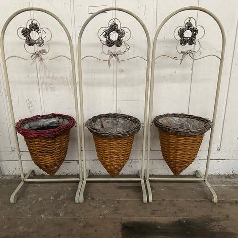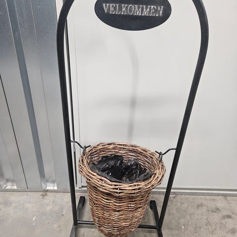 Frittstående konisk plantekurv på stativ i grå rotting. Kurven står på et sort metallstativ med tre ben og buede føtter som gir god stabilitet. Innsiden av kurven er foret med plast(noe slitt)noe som gjør den egnet til planting eller bruk med potter. Formen er smal nederst og vid øverst, og egner seg til dekorative oppsatser og grønne planter.