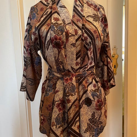 Lett vattert kimonojakke. Jakken er reversible, så den kan brukes begge veier som vist på bildene, enten med blomsterdesign eller bare gul! Ingen bruksmerker, som ny. Kjøpt på Vero Moda ifjor , nypris var 849,-