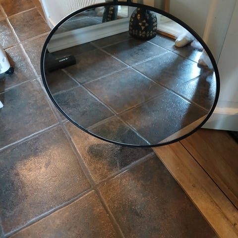 Avrundet speil, har en bulk på siden, se bildet. Speilet er 35cm x 121cm, ny pris var 899kr fra kremmerhuset.