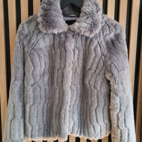 Marc Cain jakke i beige fuskepels for dame i størrelse M. Jakken har myk, pelslignende overflate og kort modell. Innsiden er helfôret med glatt fòr med grafisk motiv. Passer som ytterjakke i overgangssesonger eller som et varmere lag over andre plagg.
